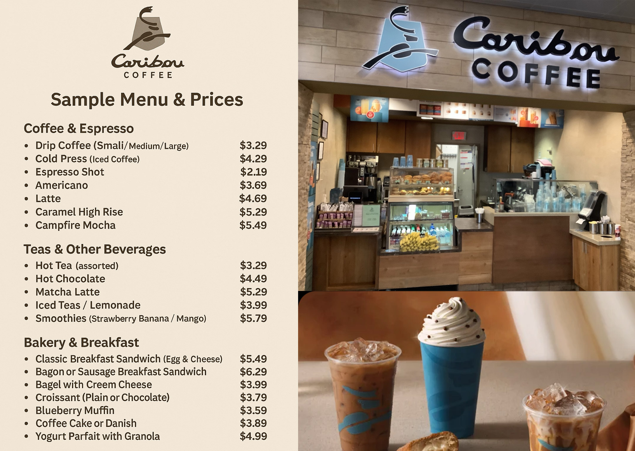 - Fresh-brewed drip coffee, handcrafted lattes, cappuccinos, and mochas – starting at $3.29