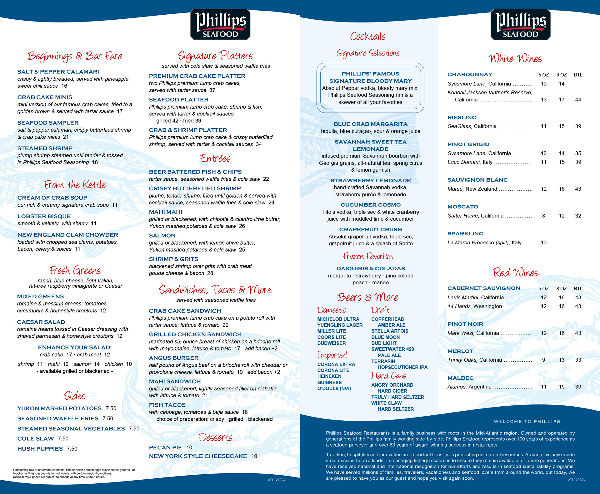 They also usually offer a full bar with cocktails (like a Blue Crab Margarita or Bloody Mary with Phillips seasoning), wines, and beers, plus a grab-and-go counter for quicker bites like crab cake sliders or shrimp cocktails.